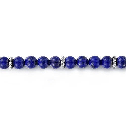 Blue lapis beads accentuate this bold men's bracelet. Segments of twisted 925 sterling silver are stationed at regular intervals, serving as spacers between the beads. This simple style is elevated by quality materials and exceptional craftsmanship to stand the test of time.