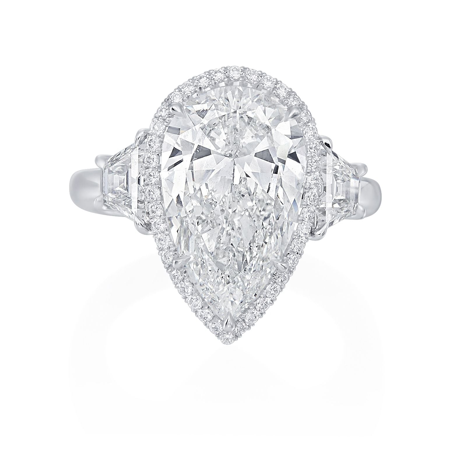 This elegant platinum ring features a stunning 5.02 carat pear-shaped diamond with H color and SI2 clarity, certified by GIA. Encircled by a halo of 0.87 carats of sparkling diamonds, this piece highlights the beauty and brilliance of the center stone. Perfect for those who seek a sophisticated and timeless design in their jewelry collection.