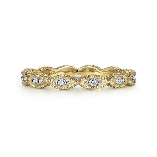 Luminous 14K yellow gold ring designed for stacking featuring brilliant 0.10ct diamonds. Marquise shapes create a scalloped silhouette, elevated with milgrain borders and engraving along the profile of the stackable band.