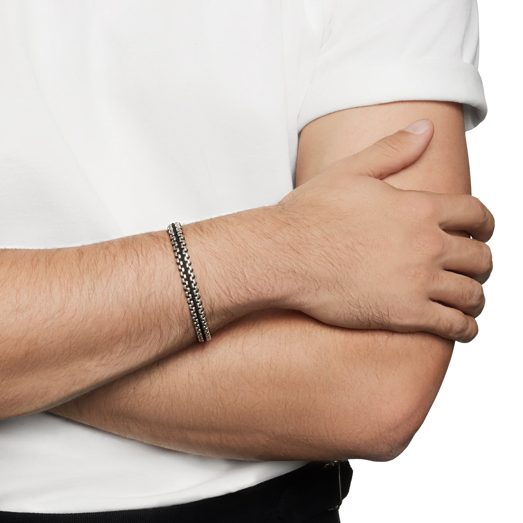 Woven Box Chain Bracelet in Sterling Silver with Black Nylon, 10mm