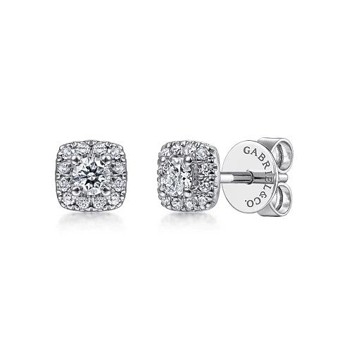 14K White Gold Cushion Halo Round Diamond Stud Earrings