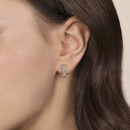 14K Yellow-White Gold Twisted 15mm Diamond Huggie Earrings