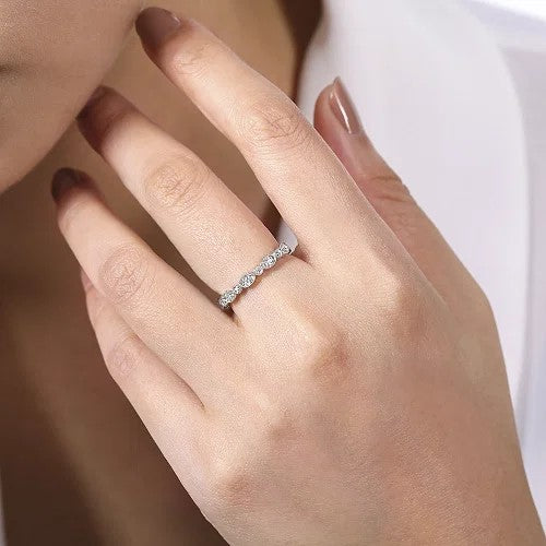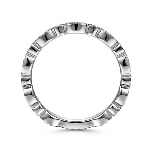 This stackable diamond ring is as stunning on its own as it is mixed and matched with other rings. The versatile 14K white gold setting is contoured to create round and oval silhouettes framed in elegant milgrain borders. Dazzling 0.20ct diamonds complete this refined ring.