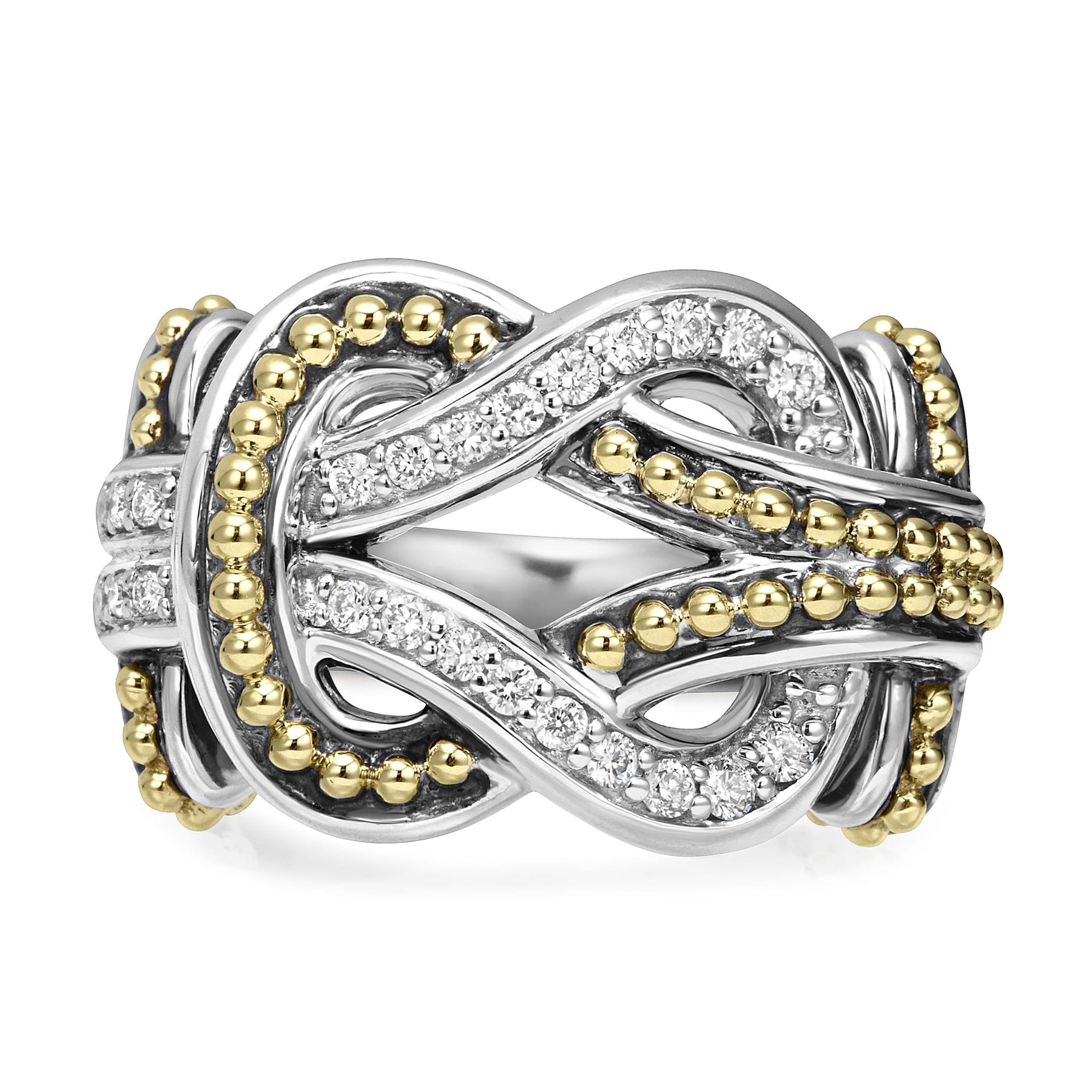 Diamonds and 18K gold woven in a knot motif form this statement ring. LAGOS diamonds are the highest quality natural stones.