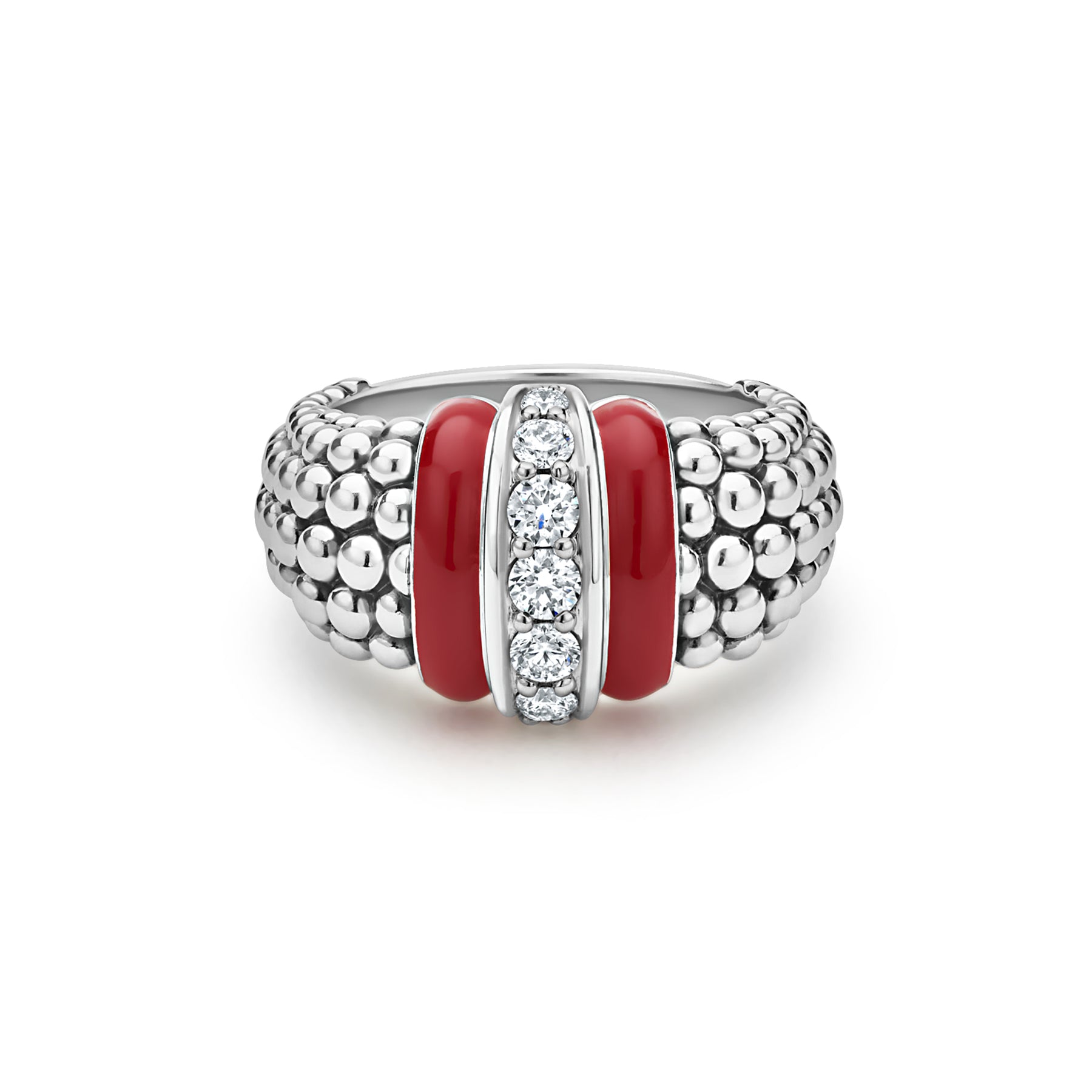 Diamonds set in sterling silver are accented by sleek red enamel and Caviar beading on this ring. LAGOS diamonds are the highest quality natural stones. A Sissy's Log Cabin exclusive.