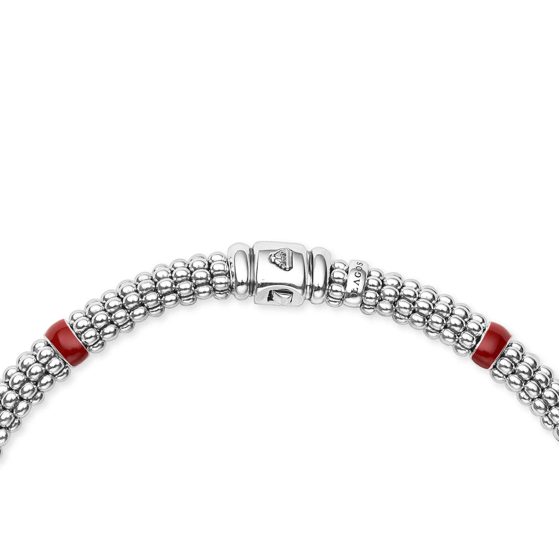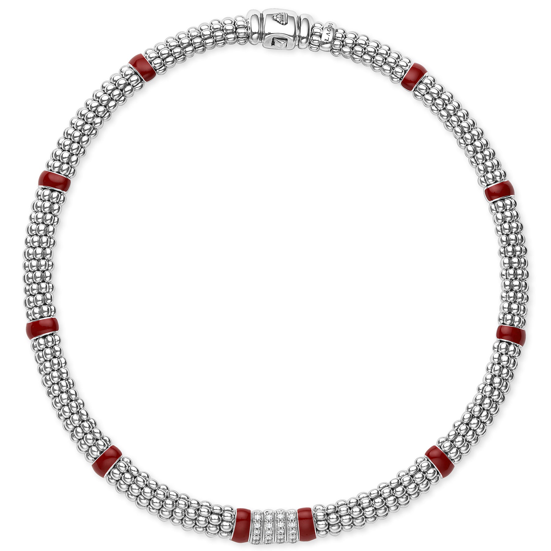 Four diamond stations surrounded by ten red enamel stations and sterling silver Caviar beading. LAGOS diamonds are the highest quality natural stones.  A Sissy's Log Cabin exclusive.
