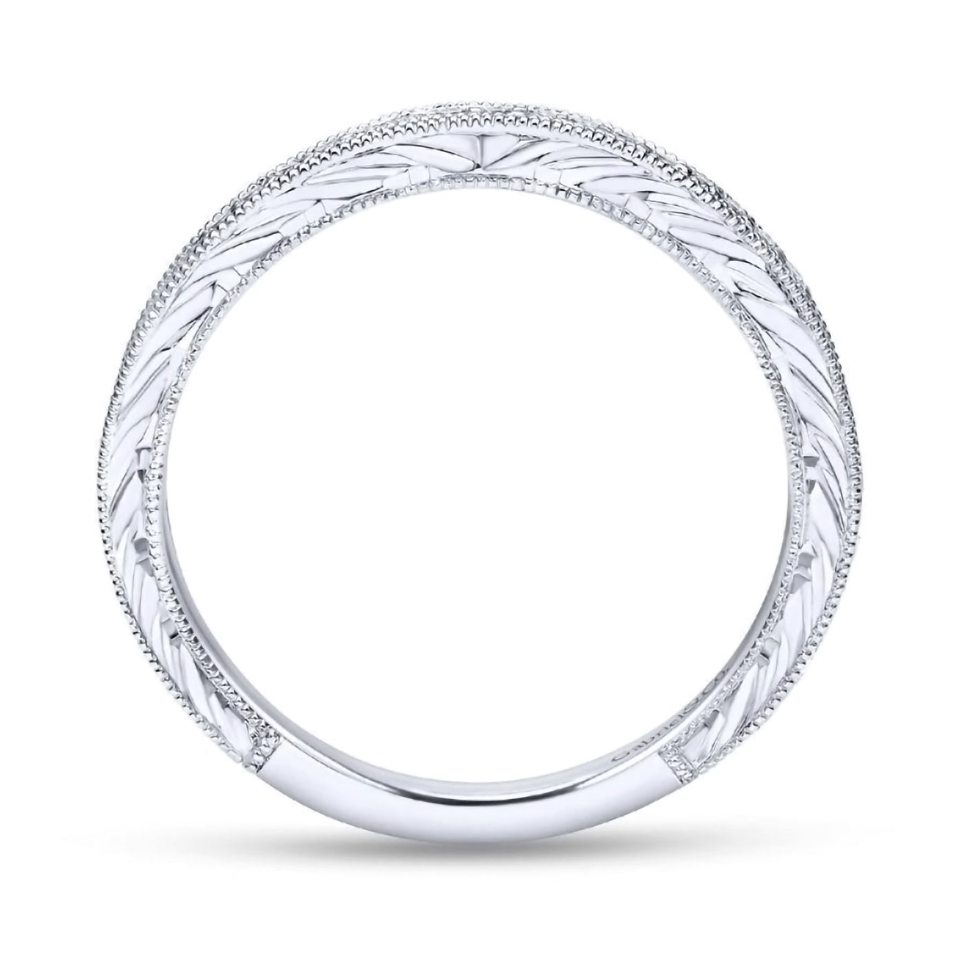 Enjoy this beautiful 14kt wtite gold 0.13cttw diamond double milgrain contour wedding band